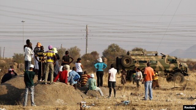 Locals look on as police patrol the area around where the shooting of striking miners occurred outside a South African mine in Rustenburg, 100 km (62 miles) northwest of Johannesburg, August 17, 2012.